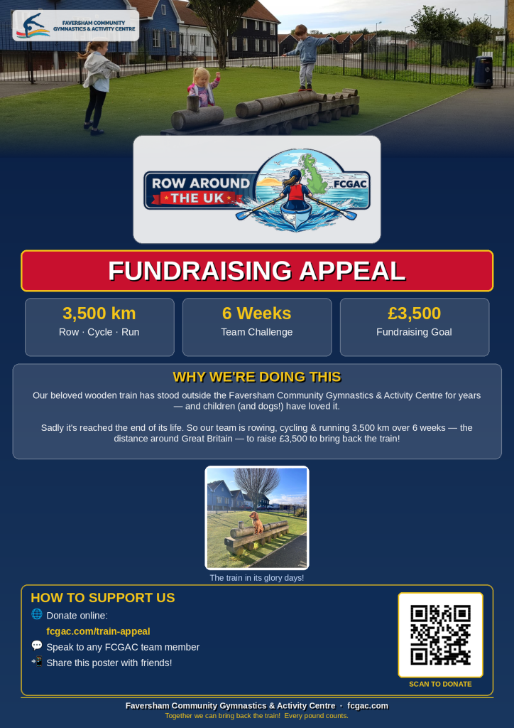 FCGAC is kicking off a fundraising appeal to replace the beloved wooden train outside the entrance to the Centre. Led by our Chair of Trustees, staff and friends of the Centre will be attempting to row, cycle, run, and otherwise work themselves across 3,500km of distance over approximately 6 weeks in order to raise at least £3,500. You can donate by visiting our appeal page. All donations are very welcome!